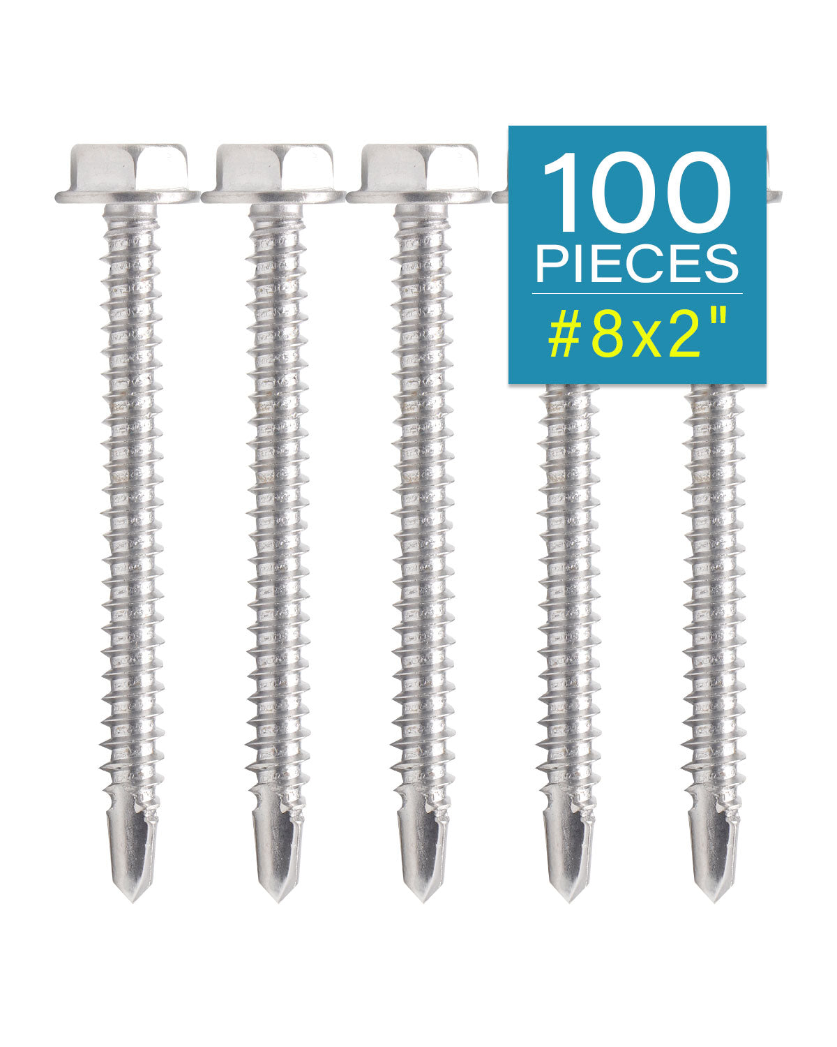IMScrews 100pcs #8 x 2" Stainless Hex Washer Head Self Drilling Screws, 410 Stainless Steel Full Thread Sheet Metal Tek Screws