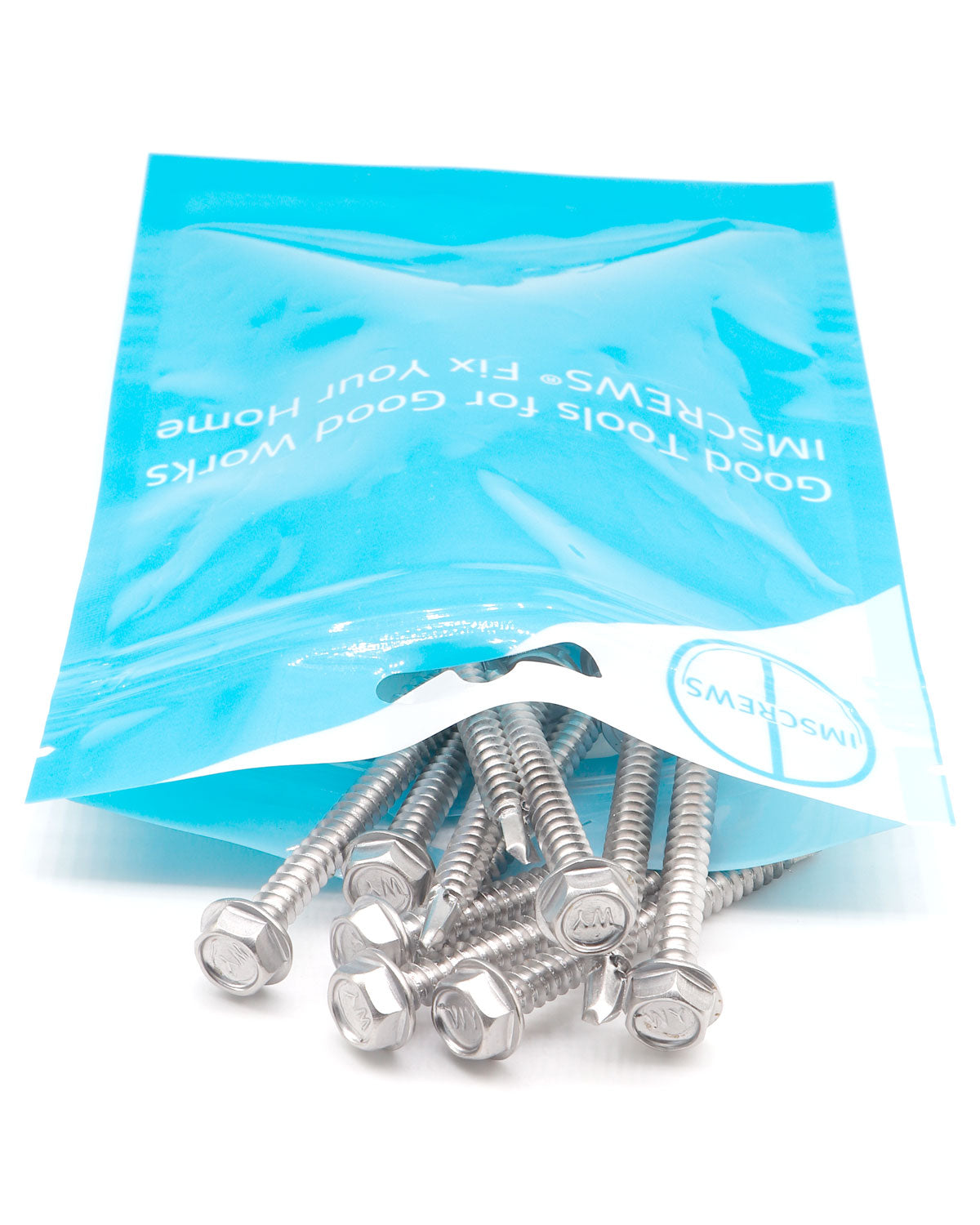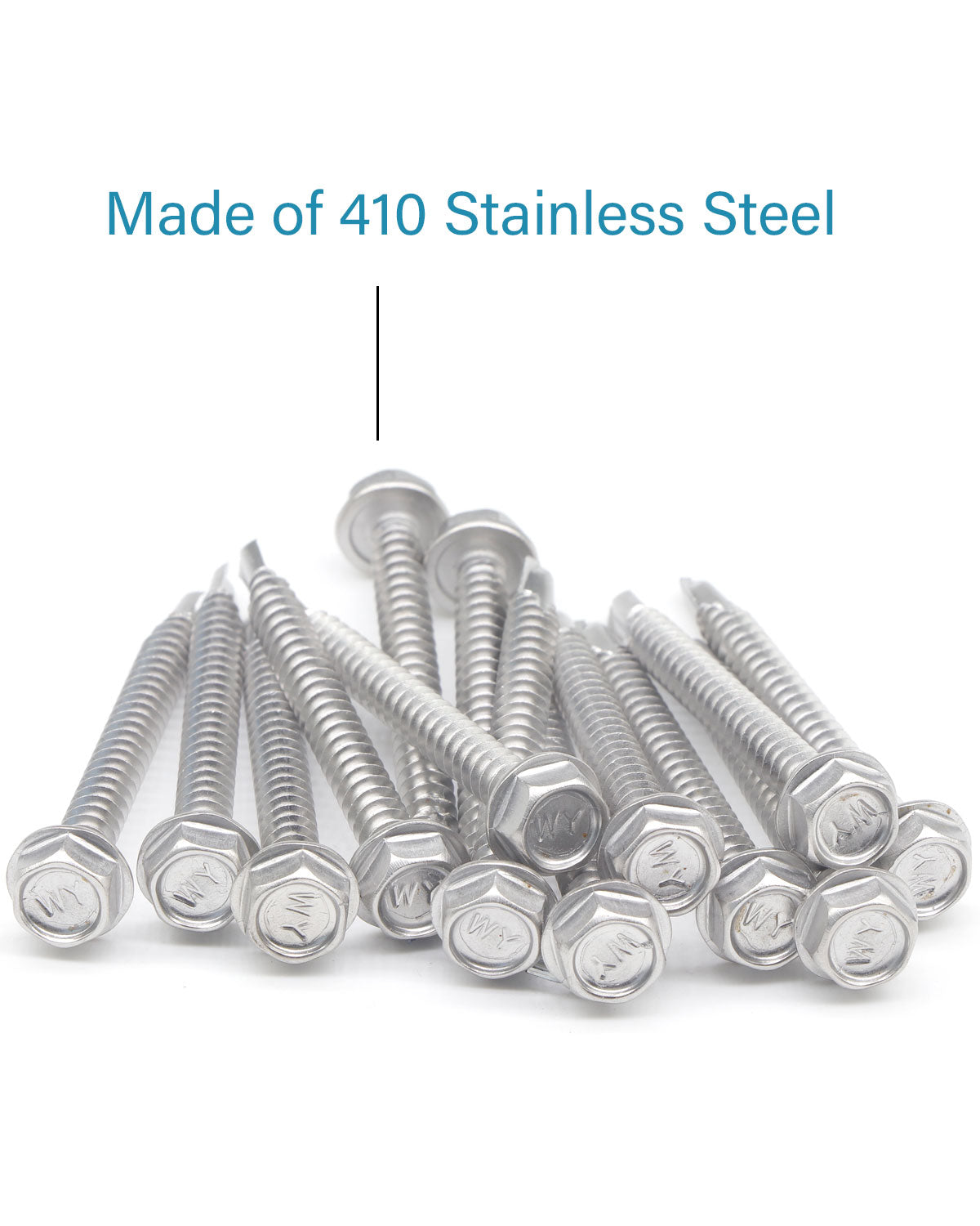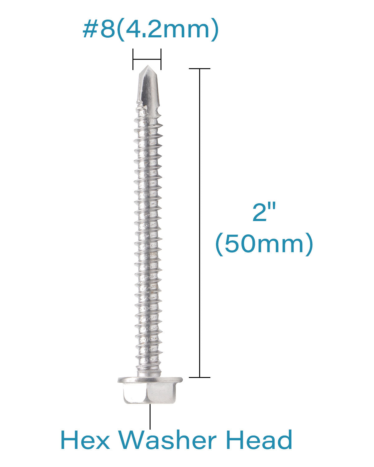 GOOD TOOLS FOR GOOD WORKS, IMSCREWS FIX YOUR HOME. IMSCREWS 410 STAINLESS STEEL FLANGED HEX WASHER HEAD SELF-DRILLING SCREWS PACKAGE SPECIFICATIONS: ?? Diameter: #8(4.2mm)?? Length: 2¡±(50mm)?? Head Style: External Hex Washer Head ?? Point Style: Self-drilling ?? Material: Stainless Steel 410?? Package Quantity: 100-Piece ?? High Quality Fully Threaded Hex Washer Head Self Drilling Screws FEATURES: ?? These screws have a sharp point to drill in wood and metal sheet and other steel material, and coarse thread design to help for excellent retention. Use self-drilling screw to fasten materials to aluminum or sheet metal. ?? The hex washer head accepts the socket driver to help prevent over-tightening and damage to the thread or fastener, can be easily installed with suitable hex driver. ?? This screws is organized by Size / Type in a Transparent Storage bag for Quick Access and Protection in an IMSCREWS plastic bag. ???WARNING: All screws products are special sharp with screw point, please keep away from kids.