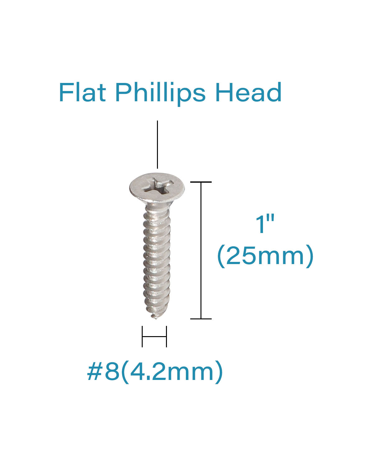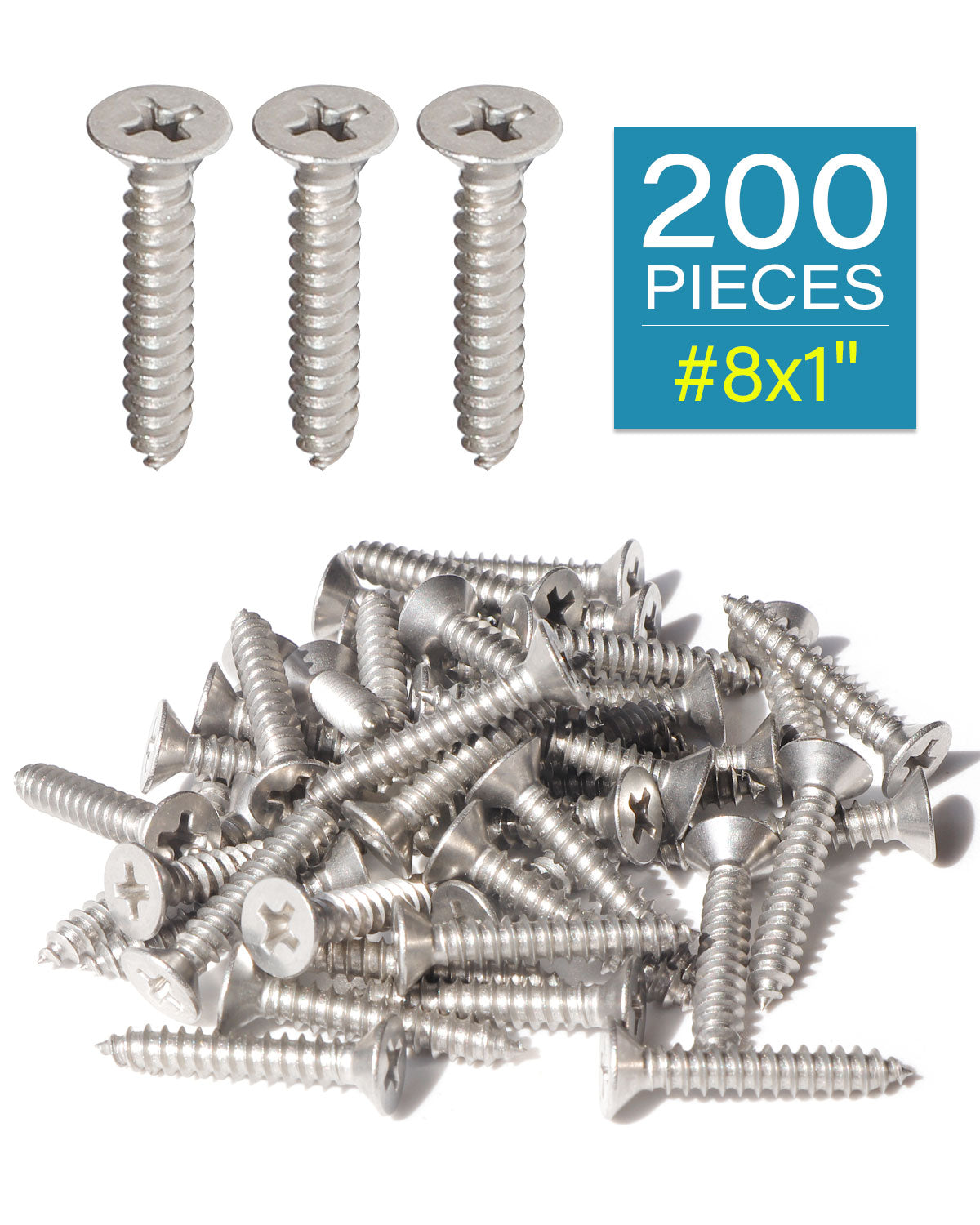 GOOD TOOLS FOR GOOD WORKS, IMSCREWS FIX YOUR HOME. IMSCREWS FLAT HEAD PHILLIPS WOOD SCREWS #8 x 1" (25mm) 200PCS HIGH QUALITYSPECIFICATIONS:?? Diameter: #8, Phillips drive?? Length: 1"(25mm) ?? Material: 18-8 Stainless Steel ?? Package Quantity: 200-Piece?? Drive Type: Phillips Drive; Head Style: Flat Head ?? High Quality Coarse Thread Self Tapping Flat Head Phillips Screws FEATURES: ?? These screws have a sharp point to drill in wood and metal sheet, and coarse thread design to help grab into wood studs.  ?? The Phillips drive has an x-shaped slot that accepts the Phillips driver and is designed to allow the driver to slip out of the head to help prevent over-tightening and damage to the thread or fastener.  ?? This screws is organized by Size / Type in a Transparent Storage bag for Quick Access and Protection in an IMSCREWS plastic bag.  ???WARNING: All screws products are special sharp with screw point, please keep away from kids.